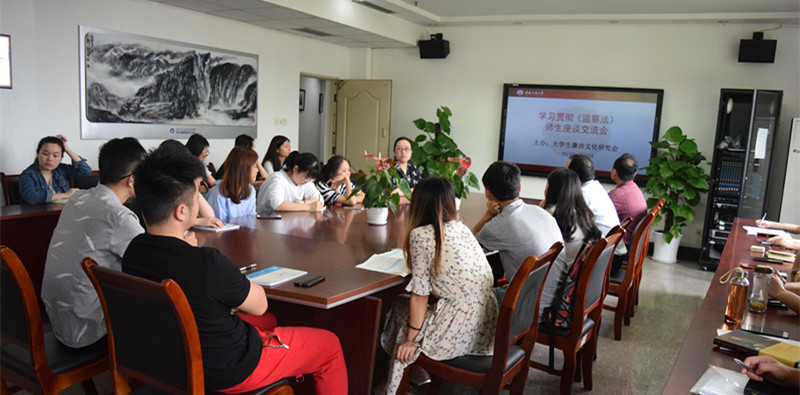 2018年5月23日下午,由重庆廉政研究中心主办,大学生廉洁文化研究会(以下简称“廉研会”)承办的“学习《监察法》师生座谈交流会”在慧智楼91110会议室举行。重庆廉政研究中心副主任袁维勤副教授和专职研究员王栋副教授主讲,来自于法学院、马克思主义学院等学院的廉研会社团成员30余名学生参与了此次交流会。会议由廉研会指导教师魏新欣老师主持。