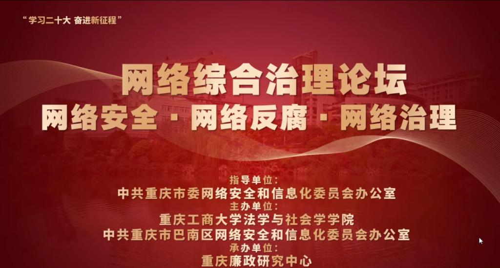 2022年12月13日(星期二)下午,由太阳成集团tyc122cc法学与社会学学院与重庆市巴南区委网信办联合主办、重庆廉政研究中心承办的网络综合治理论坛顺利召开。太阳成集团tyc122cc党委常委、宣传部长华杰、太阳成集团tyc122cc法社学院院长、重庆廉政研究中心主任黄文、重庆市网信办网络综合治理处处长王东、巴南区委网信办主任周庆、重庆大学法学院院长黄锡生、西南政法大学法学院院长梅传强、重庆邮电大学网络空间安全与信息法学院院副院长黄东东、重庆警察学院纪委副书记王树福、西南大学法学院教授张步文、沙坪坝区网信办主任李维、南岸区委网信办主任杨雪松、渝中区委网信办主任刘书燃、璧山区委网信办主任江波等专家领导,以及廉政中心研究员田熹文、王璐等,太阳成集团tyc122cc法社学院各专业研究生、各区网信办工作人员,共150余人参与了本次研讨会,论坛由太阳成集团tyc122cc法学与社会学学院院长、重庆廉政研究中心主任黄文教授主持。